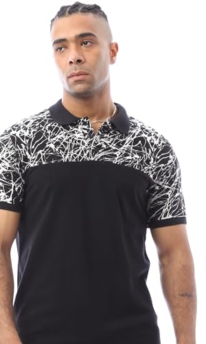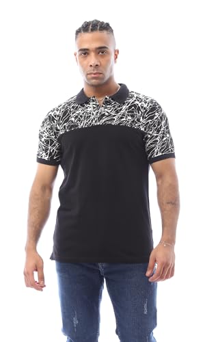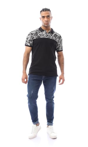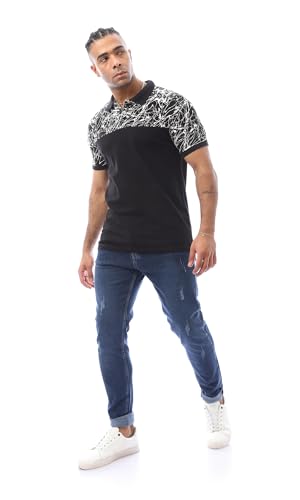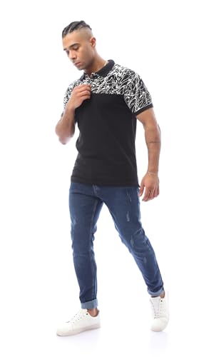Ravin - ريفين تيشرت بولو سادة منقوش على الكتفين للرجال - اسود وابيض عصري