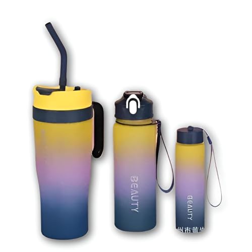- This product features a set of three colorful gradient water bottles made from durable plastic, designed to add a vibrant touch to any occasion, whether it's outdoor activities, parties, or daily hydration needs.
