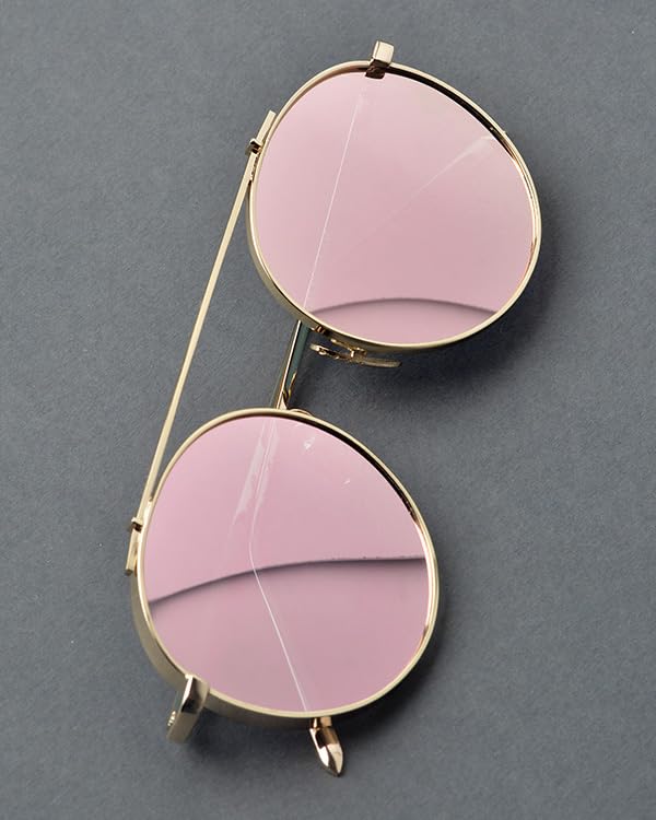 Generic - نظارة شمسية دائرية باطار ذهبي مع عدسات عاكسة بلون بينك وردي، تصميم بدون جسر للجنسين