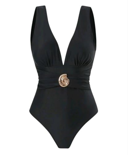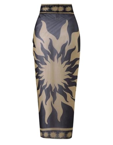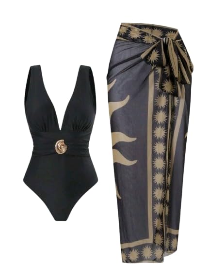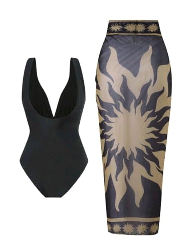 SHEIN-2pcs/Set Solid Black One-Piece Swimsuit & Mesh Placement Print Maxi Dress