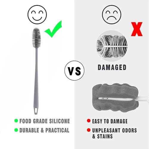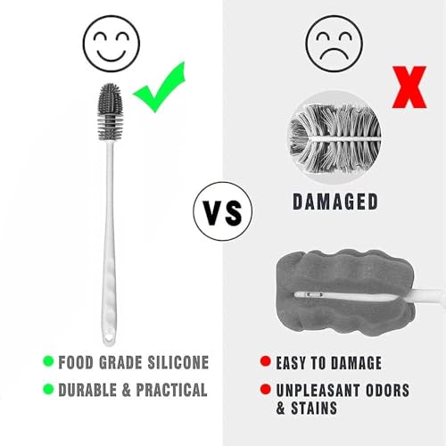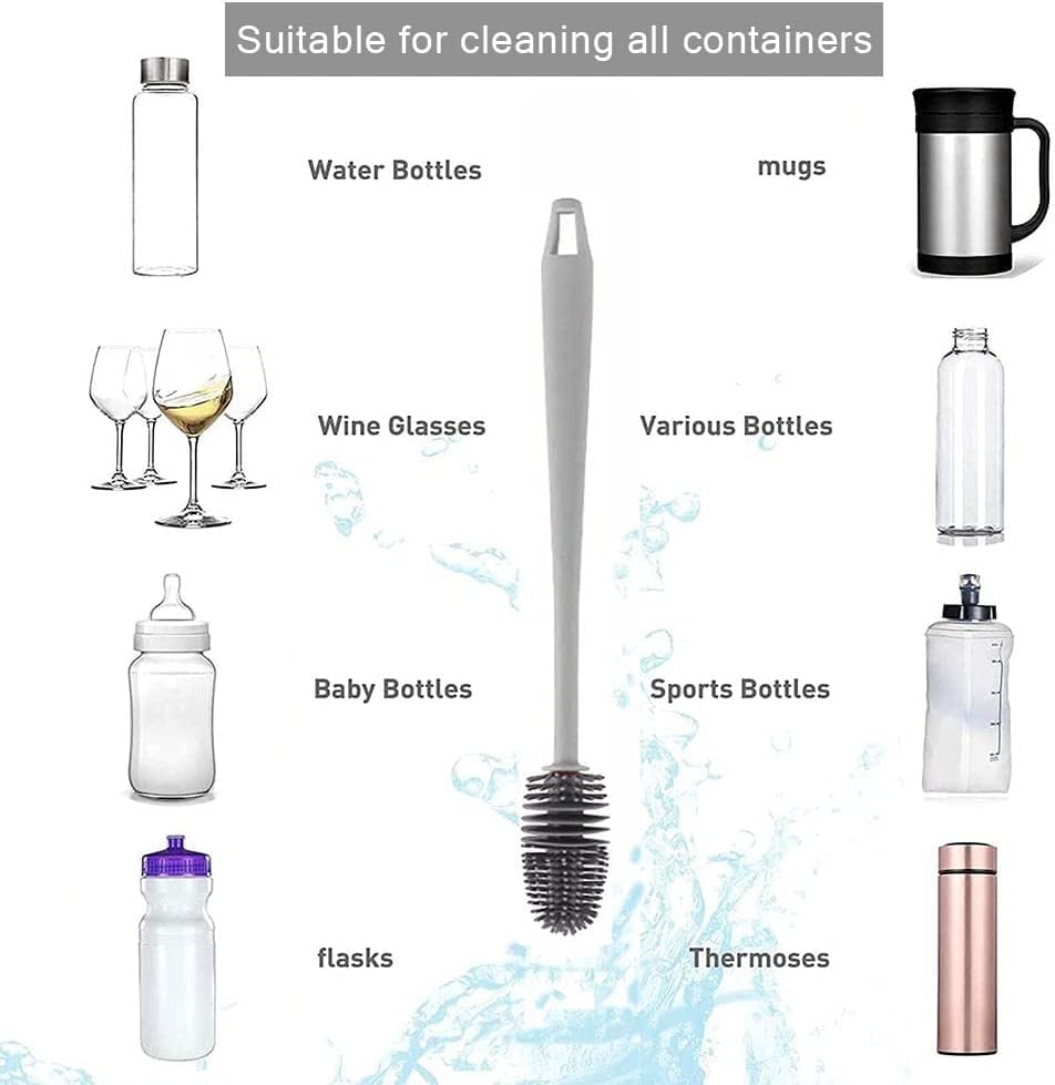 - 1. Made of high quality silicone to provide effective cleaning without scratching. 2. Long handle design makes it easy to reach bottom of bottles and jars.3. Soft brush fits clean baby bottles and curls without damaging it.4. Flexible and bendable to clean tight and hard to reach places 5. Easy to use and clean, making it a perfect tool for kitchen and baby supplies..