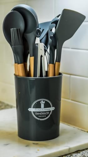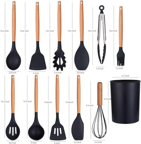 Generic - Silicone Wooden Kitchen Utensils Set - Non-Stick Heat Resistant Stirring Food Stirrer Set Of 12 Pieces - Black
