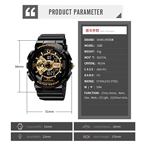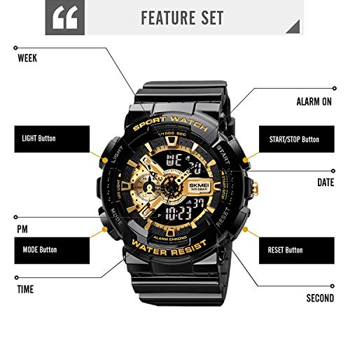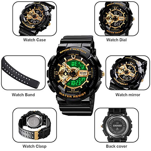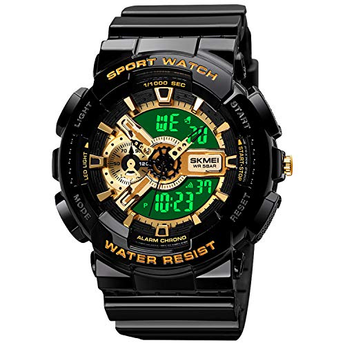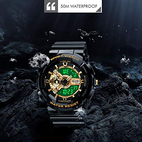 MF MINI FOCUS - SKMEI Unisex Sports Watch, 50 Meters Waterproof Personality Street Elements Luminous Engraving LED Digital Waterproof Watch, Gold/Black
