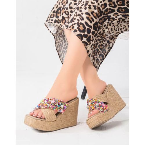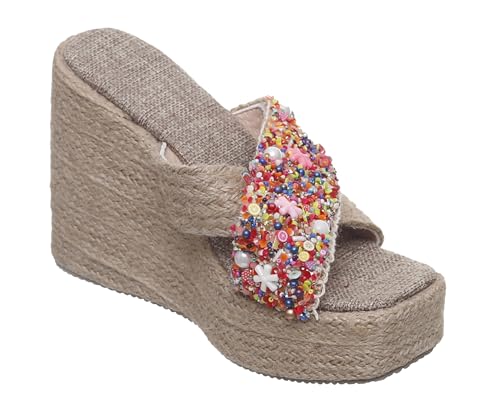Life Stylish - شبشب بكعب عريض ويدج من الخيش مع اكسسوارات انيقة S-22 - بيج