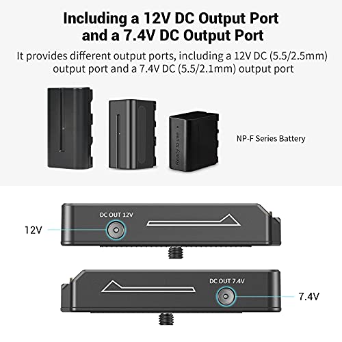 • 【12V & 7.4V Output】The NP-F battery adapter plate offers various output ports, including a 12V DC (5.5/2.5mm) output port and a 7.4V DC (5.5/2.1mm) output port.
