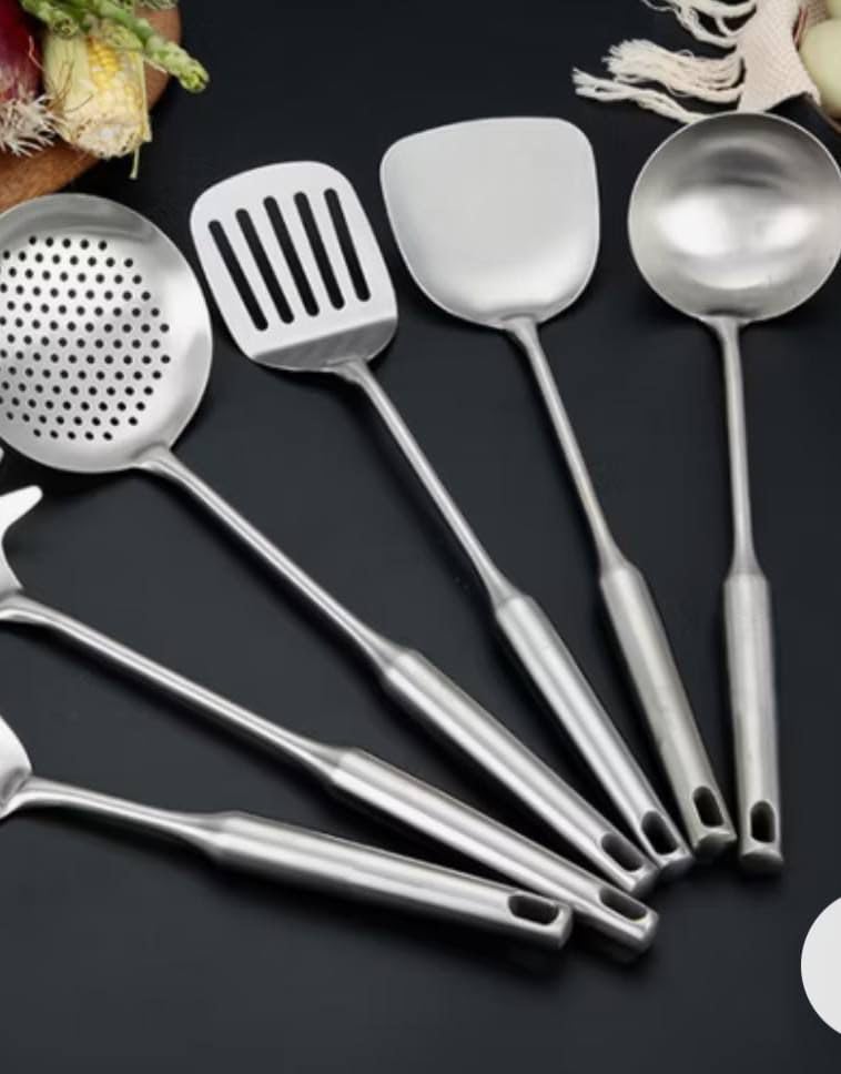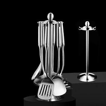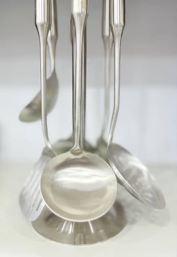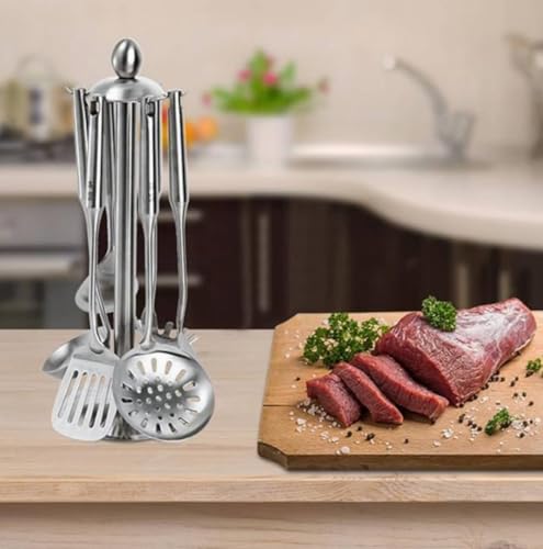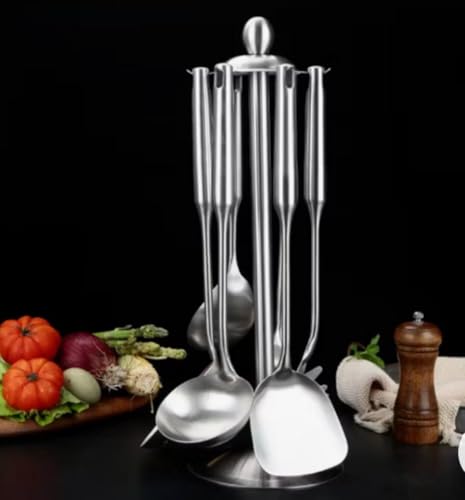 - Complete cooking set includes: slotted spoon, serving spoon, soup ladle, spaghetti spoon, spaghetti spoon, spoon, whisk + 360° rotating stand