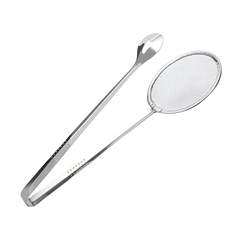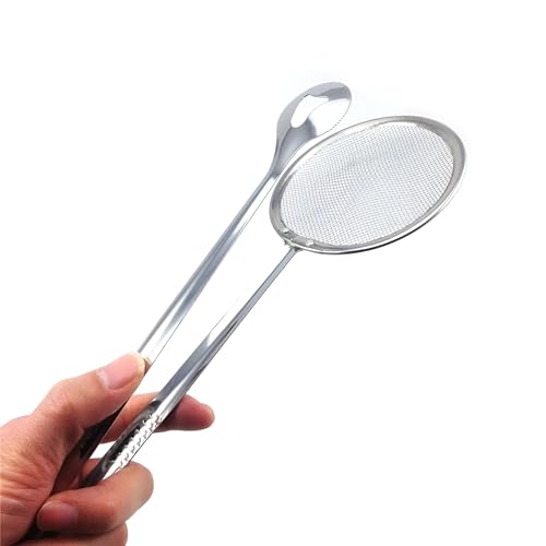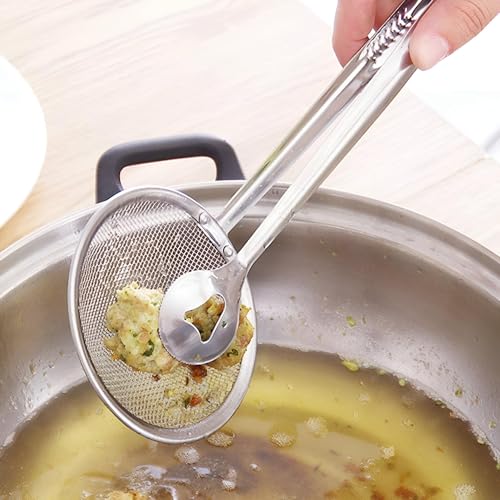 - The innovative 2-in-1 kitchen tool combines an exquisite mesh skimmer spoon with tun, making it a staple for your culinary needs. Dual function allows you to conveniently filter the oil and remove fried foods from hot oil efficiently, promoting an overall culinary experience while ensuring less mess in the kitchen.