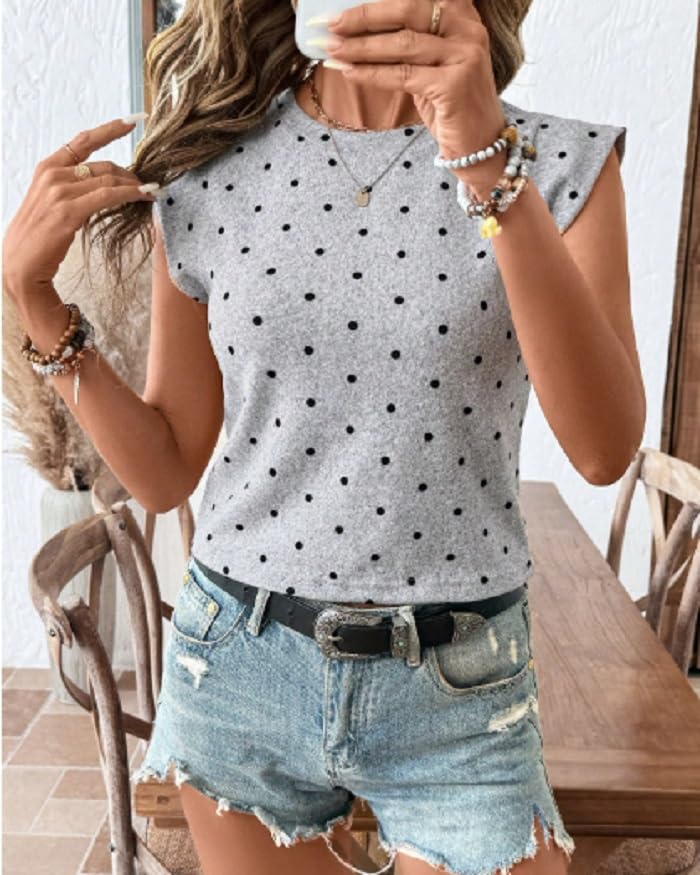 Generic - بلوزة منقطة بدون اكمام للنساء من تي-شريت، قماش محبوك رمادي، قبة دائرية، قصة عادية