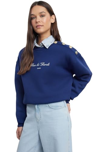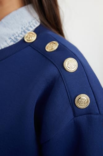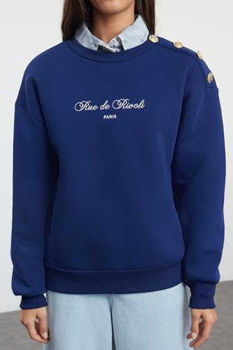 Trendyol - Trendyol Woman Navy Blue Slogan Embroidered Button Detailed Regular Fit Thick Inside Fleece Knitted Sweatshirt TWOAW25SW00015 Sweatshirt