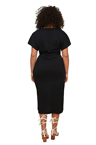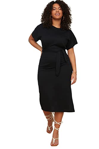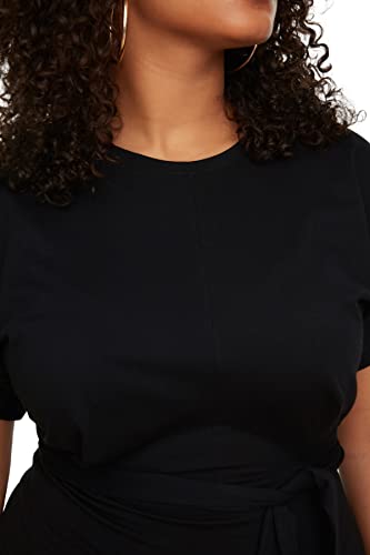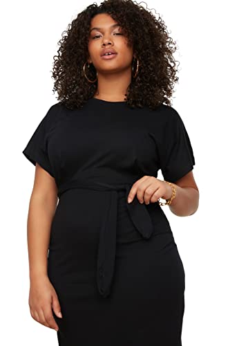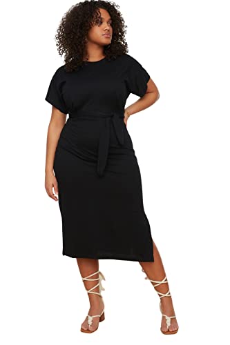 Trendyol - فستان TBBSS22EL1640 للنساء بقصة مستقيمة وفتحات وربطة فيونكة، فستان منسوج من القطن بنسبة 100% من تريندول، مقاس طويل/ كبير، لون أسود