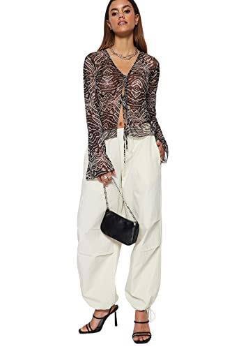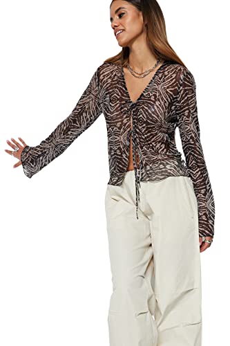 Trendyol - Trendyol Women Light Brown Patterned Tie Detailed Tulle Flexible Knitted Blouse TWOSS23BZ00139 Blouse (pack of 1)