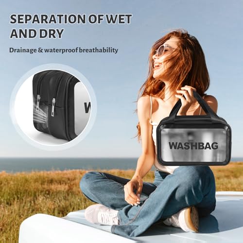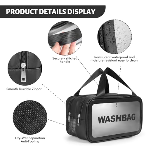 - لمسة نهائية شفافة: تصميم حقيبة الاستحمام يحتوي على جزء شفاف بلوري لإخفاء الأشياء وسهولة التعرف عليها؛ كما أنها تحتوي على قسم محكم الغلق لتخزين البضائع الجافة وحجرة شبكية جيدة التهوية للمناشف الرطبة أو الملابس لمنع الروائح