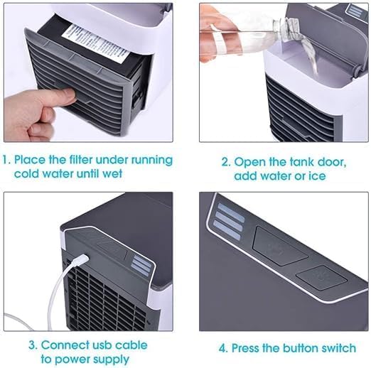 - Economical price and portable item - small size 15x17x16 cm for mobile use. Design with built-in water tank, convenient to carry anywhere, even outside when you go with your family on a vacation. The product is equipped with 5V 2A USB Charger Interface, as long as you have a USB interface our product is ready to work. You can use this fan wherever you are. Efficient alternative to A/C unit and also an efficient alternative to fan and economical price and energy saving.