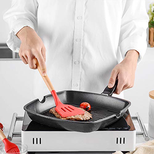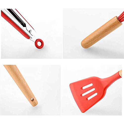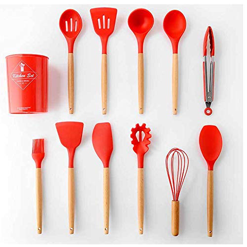 Wekity - طقم توزيع سيليكون مقاوم للالتصاق مع حامل مكون من أدوات مطبخ وطهي مع ملعقة سباتولا ومعلقة مخرمة لتقليب الطعام وملاعق وفرشاة ومضرب ومساكة طعام من ويكيتي، طقم 11 قطعة بلون أحمر