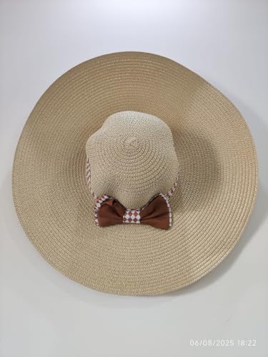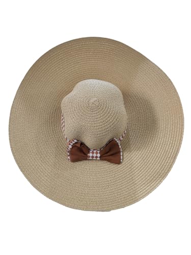 Generic - Wide Brim Sun Hat, Straw with Brown Checkered Bow, Summer Beach Hat