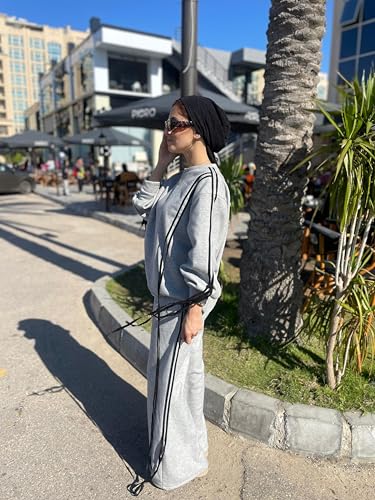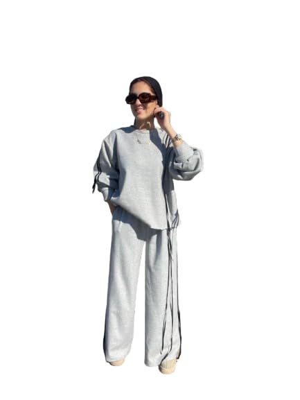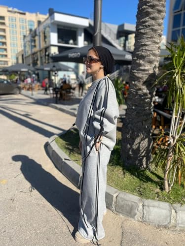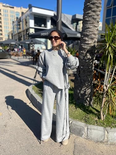 Generic - طقم ملابس نوم كاجوال من قطعتين للنساء، سويت شيرت من مزيج القطن بلون رمادي مرقش وسروال بارجل واسعة، ملابس متناسقة