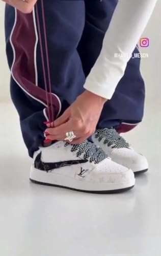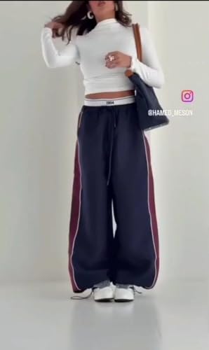 Generic - بنطلون رياضي نسائي واسع الساق، كحلي مع خط جانبي عنابي، قماش مريح