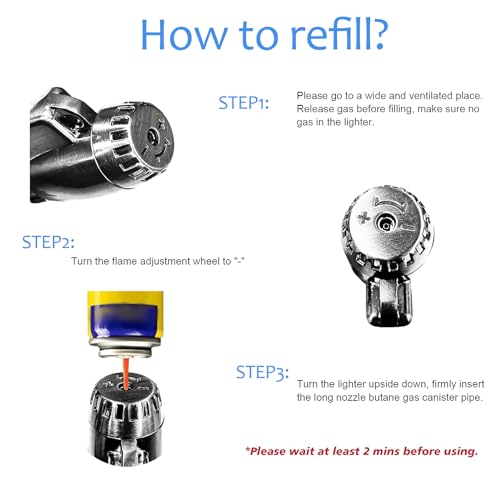 - [Flame Adjustable & Gas Refillable] Compared with disposable lighters, the butane lighter can be refilled many times, choose any brand of butane gas canister with a long nozzle to refill before your use.