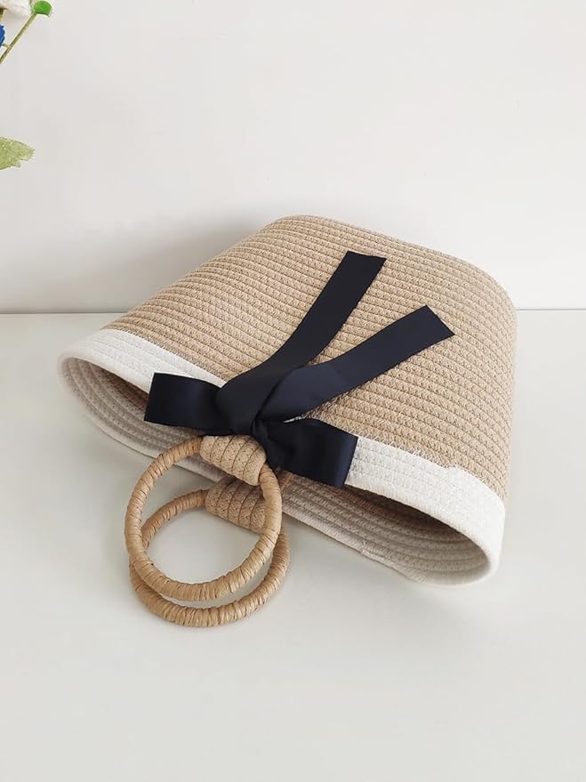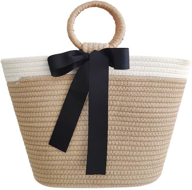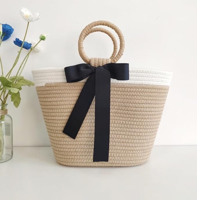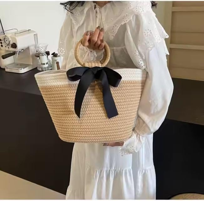 Generic - Woven Straw Beach Bag with Round Handle, Ribbon Bow, Two-Tone Natural and Beige Design