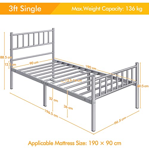 - Specifications: Material: Iron; Colour: Silver; Overall Dimensions: 196.5 cm L × 96.5 cm W × 88.5 cm H; Applicable Mattress Size: 3' Single, 190 cm L × 90 cm W; Maximum Weight Capacity: 136 kg