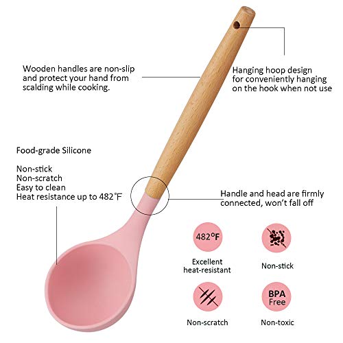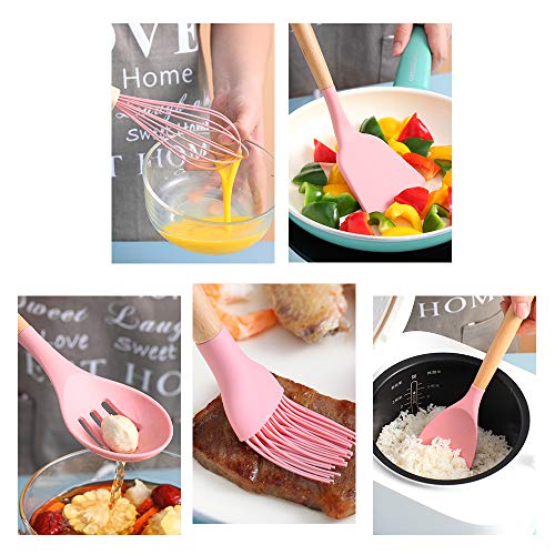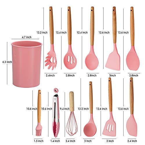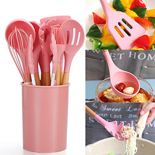 Spaceshoop - YBOBK HOME Silicone Kitchen Cooking Utensils Set with Holder, 12 Pieces Nonstick Heat Resistant Kitchen Utensils Spatula Set with Wooden Handle BPA Free Kitchen Tools Gadgets Cookware Set (Pink)