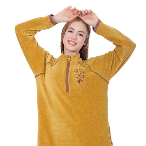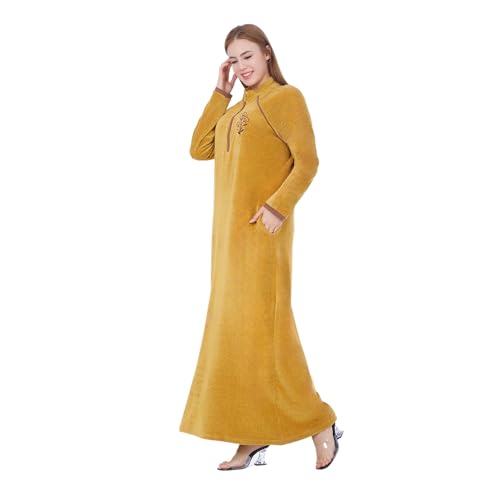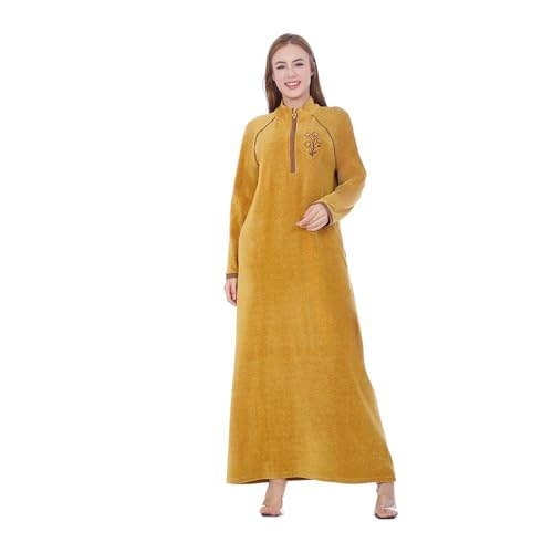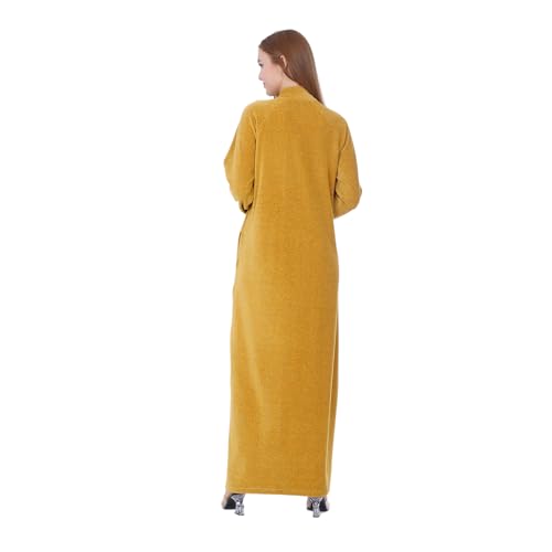 ZECOTEX - Zecotex Winter Mustard Velvet Cotton Abaya Nightgowns for Women - Special Cut on Both Sides - Flower Embroidered on Front - Zipper and Side Pockets - Long Dress Comfortable Home Wear