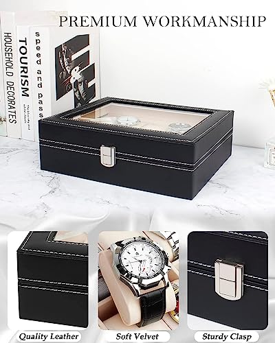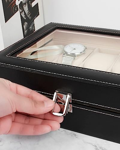 - EMPHASIZE BEAUTY OF WATCHES: With a clear glass lid, dark gray lining contrasting nicely with the black faux leather; mental clasp that shines brightly, this is a stunning display and storage piece for your watch collection