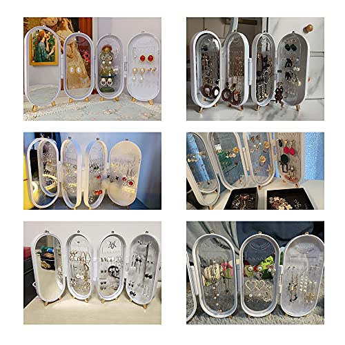 ZeroNine - ZeroNine Jewelry Travel Case Small for Women, Hanging Necklace, Earrings, Rings Jewelry Storage Box 4 Doors Foldable Screen Necklace Display Rack, Jewelry Organizer for Earrings with Mirror (White)
