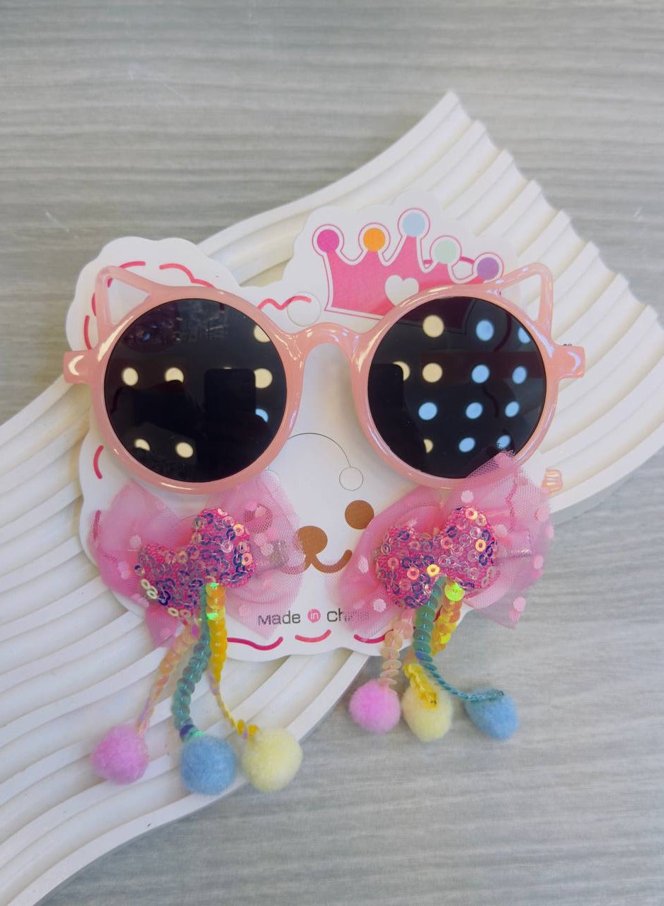 Colorful children's sunglasses with a unique modern design in the shape of a cat, paired with two clips decorated with soft tulle ribbons, shiny colors, and colorful pom-poms, adding a playful and magical touch to your little one's look! 🌟👑 Carefully designed to combine elegance and fun in every detail, perfect for a lively and joyful look, whether for special occasions or daily wear.