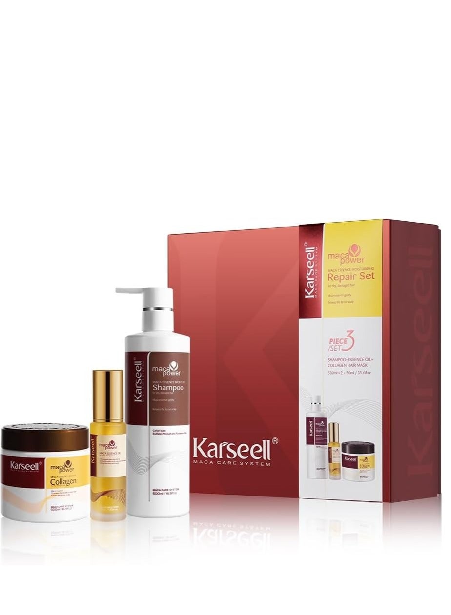 Karseell Maca Essence Moisturizing Repair Set, Collagen Hair Mask 500ml & Shampoo 500ml & Maca Essence Oil 50ml, Argan Oil Hair Treatment for Dry Damaged Hair All Hair Types