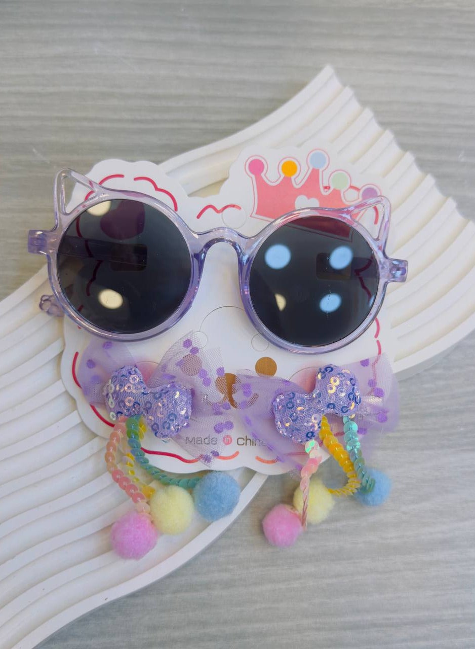 Colorful children's sunglasses with a unique modern design in the shape of a cat, paired with two clips decorated with soft tulle ribbons, shiny colors, and colorful pom-poms, adding a playful and magical touch to your little one's look! 🌟👑 Carefully designed to combine elegance and fun in every detail, perfect for a lively and joyful look, whether for special occasions or daily wear.